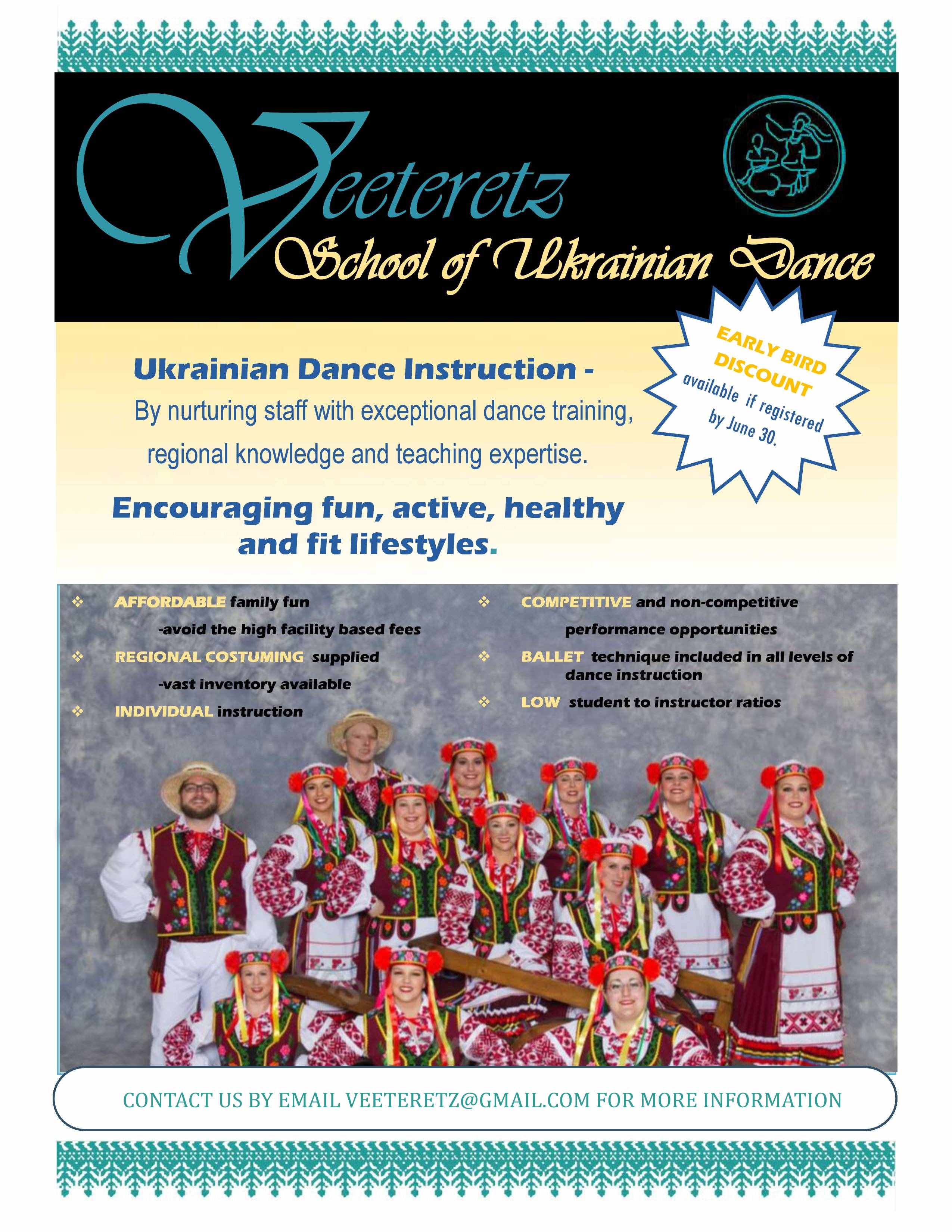 For additional information on the Veeteretz School of Ukrainian Dance 2024-2025 season contact VUDA by email at veeteretz@gmail.com
